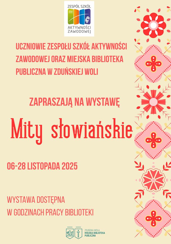 MBP Zd-Wola Łaska 12, Zduńska WolaUczniowie Zespołu Szkół Aktywności Zawodowej oraz Miejska Biblioteka Publiczna w Zduńskiej Woli zapraszają na wystawę "Mity słowiańskie" 6-28 listopada 2025