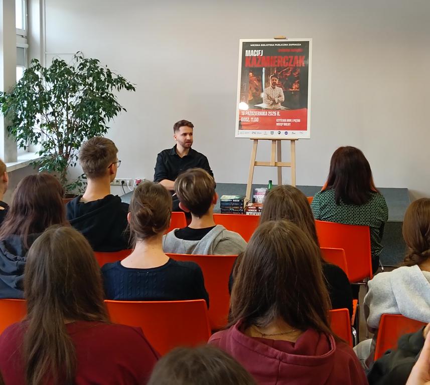 Spotkanie poprowadził sam pisarz, dzięki czemu atmosfera była bezpośrednia i swobodna. Maciej Kaźmierczak z humorem i energią opowiadał o kulisach swojej pracy, o tym, jak wygląda proces tworzenia książki – od pomysłu, przez budowanie postaci, aż po końcowe redakcje. Młodzież miała okazję zajrzeć „za kulisy” pisarskiego warsztatu i dowiedzieć się, jak powstają fabuły trzymające w napięciu do ostatniej strony.