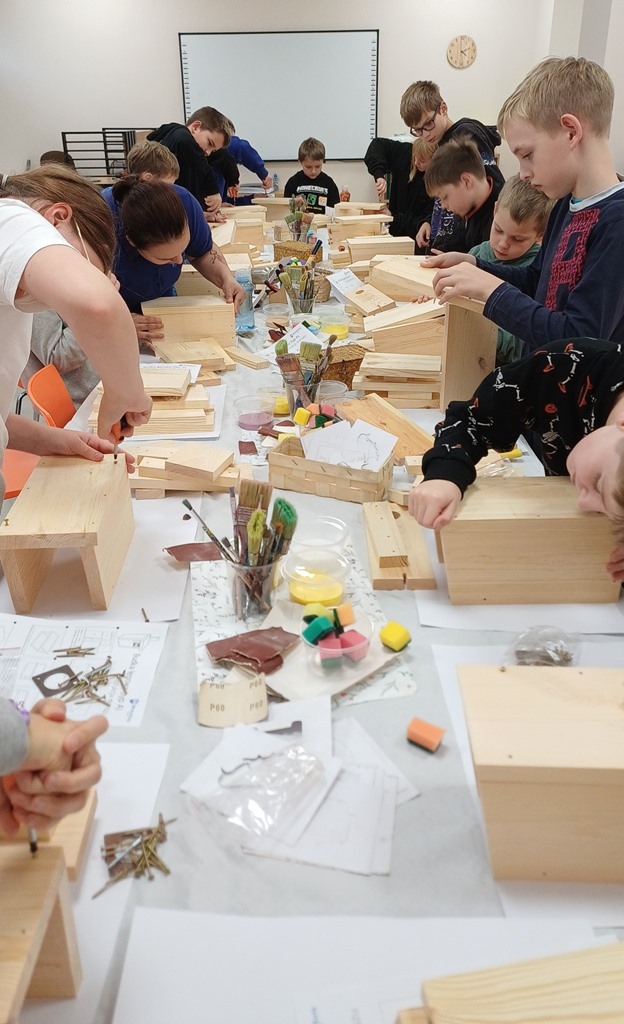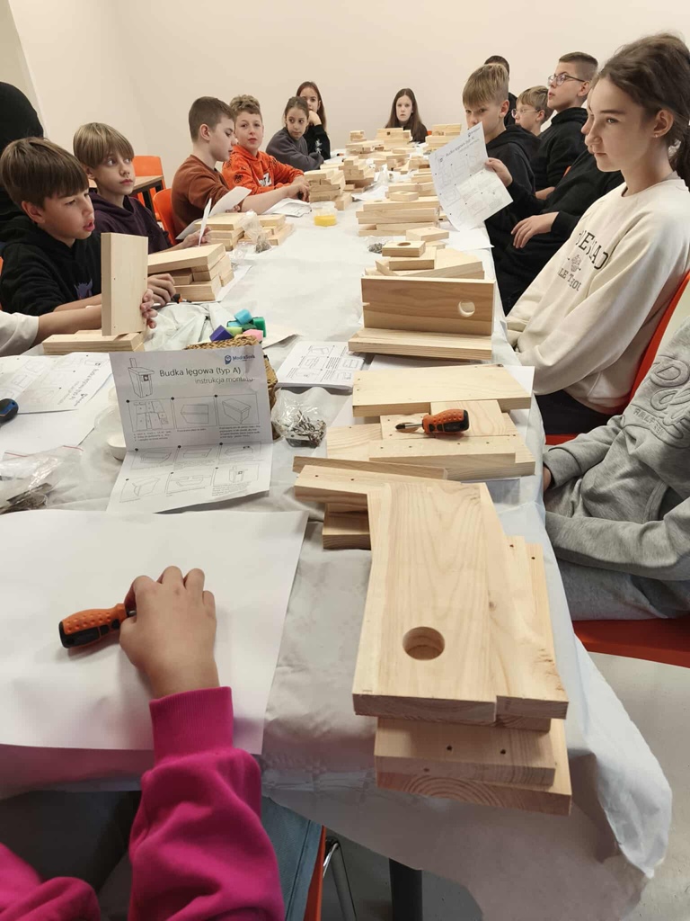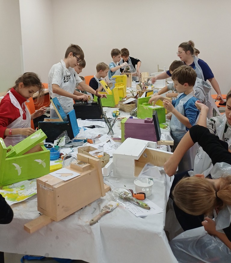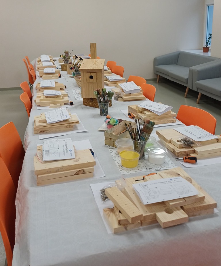 W dniu 30 września w bibliotece odbyły się warsztaty stolarskie dla dzieci. Podczas zajęć uczestnicy mieli okazję samodzielnie wykonać budki lęgowe dla ptaków. Na początku dzieci otrzymały przygotowane wcześniej elementy budek, które należało złożyć. Z pomocą prowadzących uczestnicy skręcali drewniane części, ucząc się przy tym podstaw pracy stolarskiej oraz bezpiecznego korzystania z narzędzi. Po złożeniu budek przyszedł czas na ich ozdabianie. Dzieci z dużym zaangażowaniem malowały swoje prace.